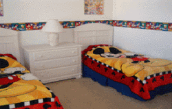 Bedroom four is twin bedded with built in wardrobes, drawers and TV. This room is decorated in a classic Disney theme for kids of all ages.