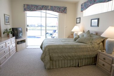The master bedroom is furnished with an American Queen sized bed. The room also has cable TV, DVD & VCR, clock- radio, telephone and hairdryer. This room also has large patio doors leading to the pool deck.