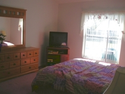 The master bedroom is approximately 12 foot by 14 foot. It is comfortably furnished with a queen bed, impressive dressing table, bedside tables with lamps and cable TV. The window overlooks the pool. It has a large walk-in closet. The ensuite bathroom has a walk in shower and twin vanity basins. There is an external door leading to the pool lanai.