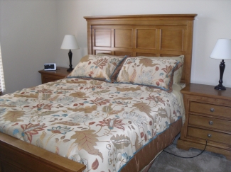 Master bedroom has king size bed, an en-suite with bath and walk-in shower, a double vanity unit and walk-in closet. Equipped with 32in HD TV. Second bedroom has a queen size bed, and third has twin beds.