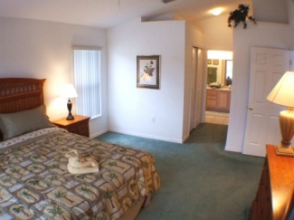 The Master Bedroom comes complete with a King size bed and full en-suite bathroom including walk-in shower, w/c and twin basins. There is a large window overlooking pool & lake and the room has its own walk-in wardrobe and cable television.