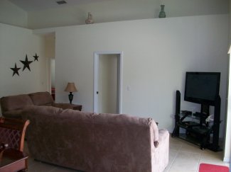 Outside to the rear you will find a fenced (for privicy) heated pool which has a fully screened cover to stop leaves, large bugs, unwanted racoons and the like entering. The sun is on the deck area all day for those of you who like to go home with some colour as well as toned legs after walking the parks. It also benifits from a shaded large Lanai area for those of you who like some shade. You also have the choice of 2 BBQ's one gas the other charcol to suit all cooking choices. There are padded loungers, chairs and a table for you to use and relax. Outside of the screened area you will find to either side of the pool, very pretty palm trees and a lawned area. To comply with US laws all external doors leading into the pool area are fitted with safety alarms.