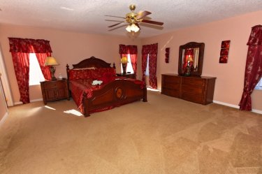 The large master king is luxuriously furnished with a king sized bed and a separate sitting area, with 65inch flat screen TV, to relax in after a long day in the parks or shopping. The master en suite contains his and hers sinks, walk in shower and a large bathtub. There is also a hairdryer for your convenience.
